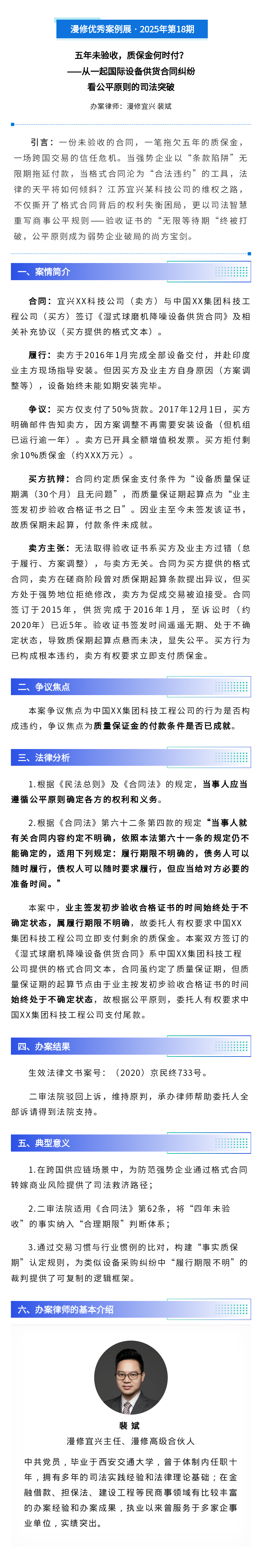 漫修优秀案例展 · 2025年第18期 | 五年未验收,质保金何时付?——从一起国际设备供货合同纠纷看公平原则的司法突破