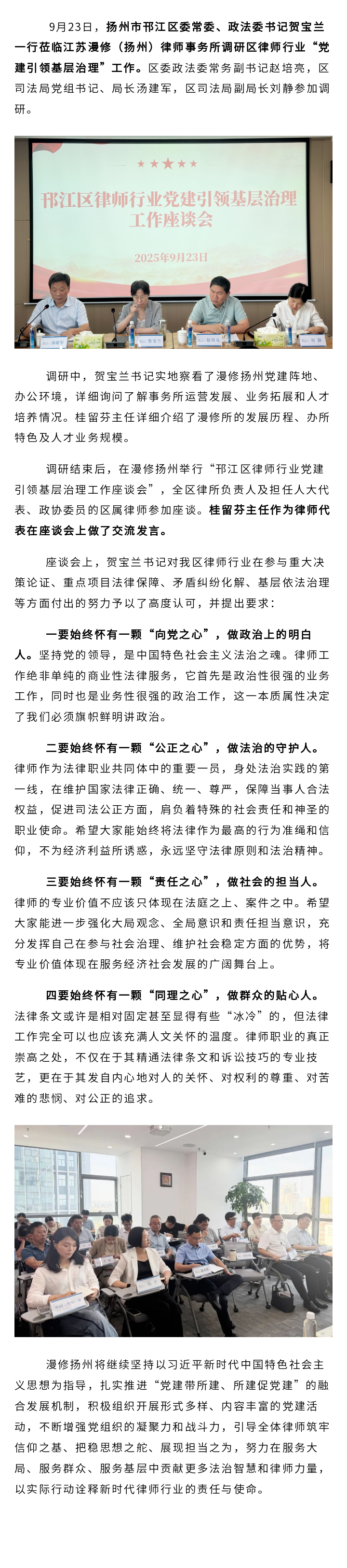 扬州市邗江区委常委、政法委书记贺宝兰莅临漫修扬州调研律师行业“党建引领基层治理”工作