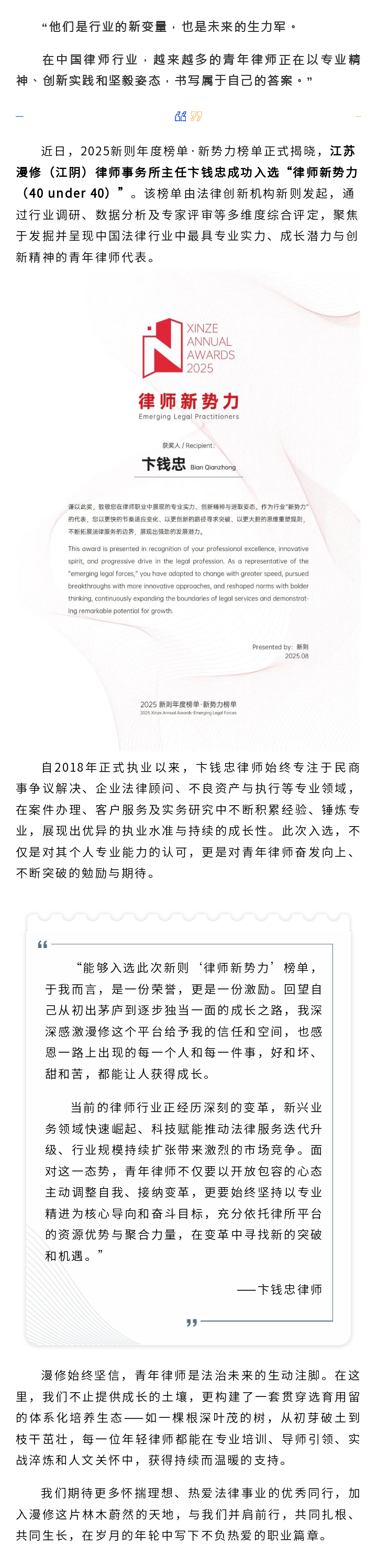 漫修卞钱忠律师荣登2025新则新势力榜单“律师新势力”(40 under 40)