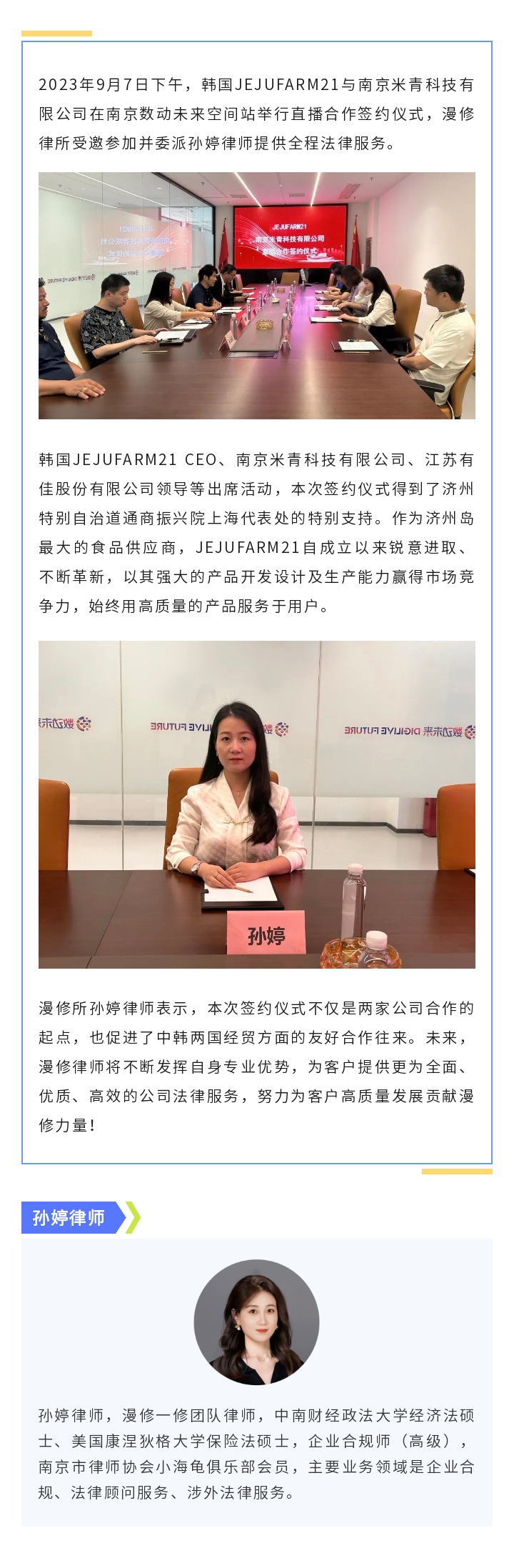 助力外贸工作 | 漫修律所受邀参加韩国JEJUFARM21与南京米青科技有限公司直播合作签约仪式