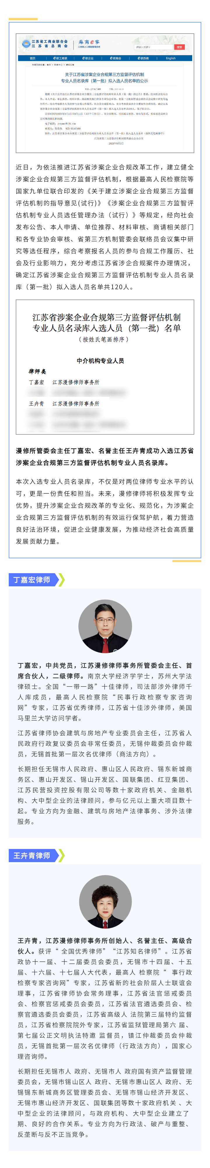 漫修资讯 | 漫修所管委会主任丁嘉宏、名誉主任王卉青入选江苏省涉案企业合规第三方监督评估机制专业人员名录库