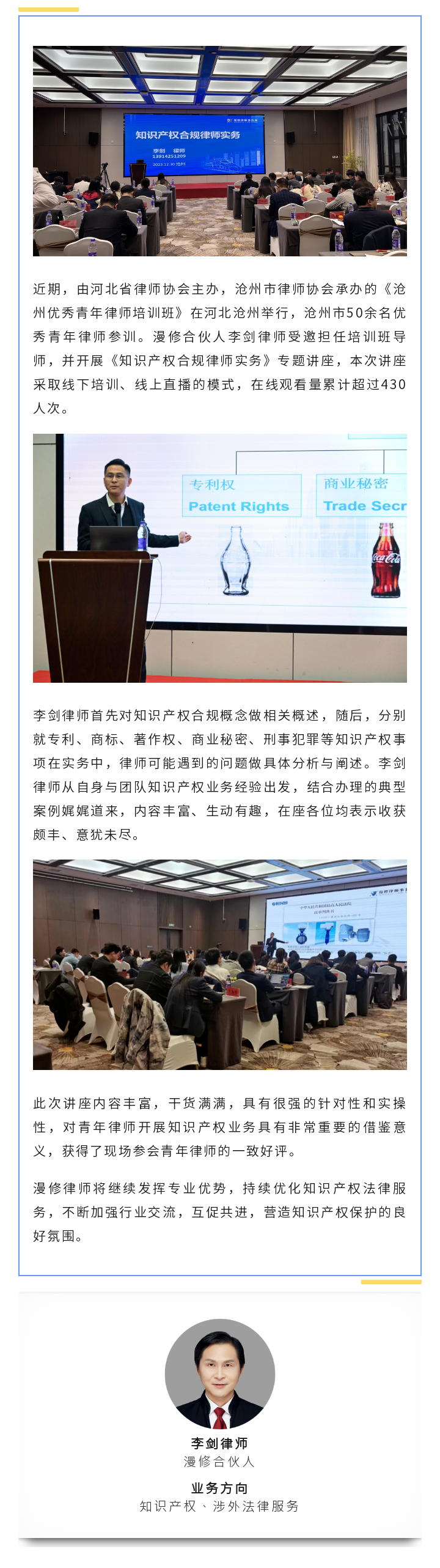 漫修资讯 | 漫修合伙人李剑律师受邀为河北沧州优秀青年律师培训班开展知产合规律师实务专题讲座