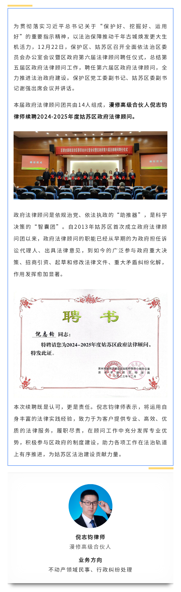 漫修资讯 | 漫修高级合伙人倪志钧律师续聘新一届苏州市姑苏区政府法律顾问