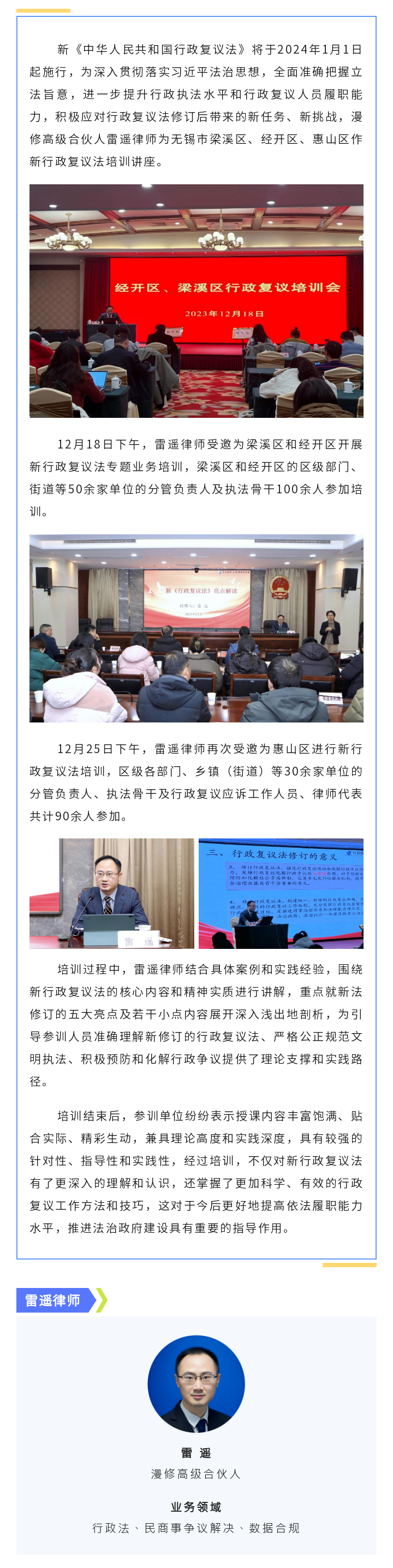 漫修资讯 | 漫修高级合伙人雷遥律师为无锡多个区作新《行政复议法》培训讲座