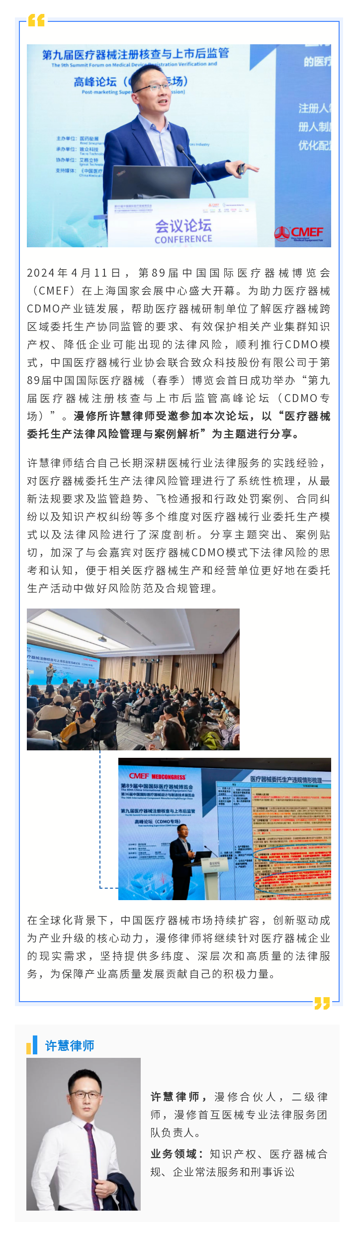 漫修许慧律师受邀参加第九届医疗器械注册核查与上市后监管高峰论坛(CDMO专场)