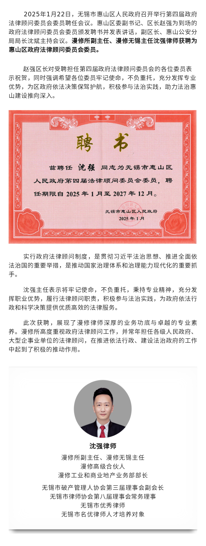 漫修所副主任沈强获聘无锡市惠山区人民政府第四届法律顾问委员会委员