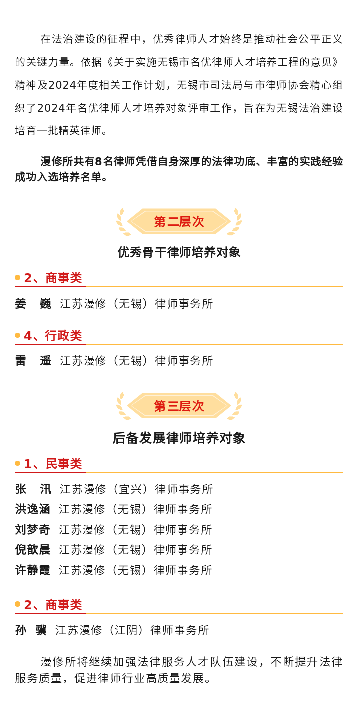 漫修多名律师入选2024年度无锡市名优律师人才培养对象