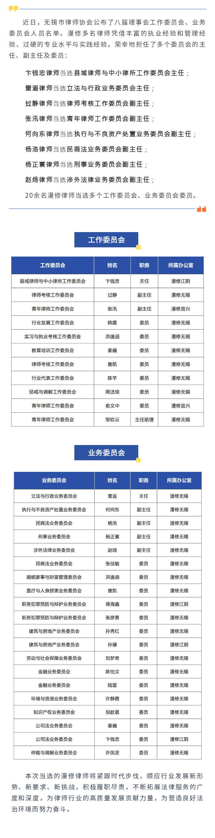 漫修三十余名律师入选无锡市律师协会八届理事会工作委员会、业务委员会