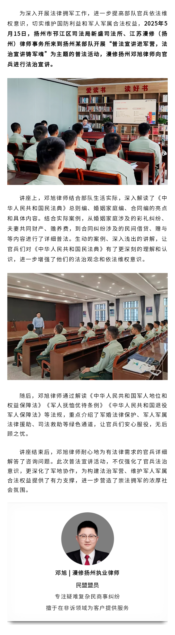 普法宣讲进军营 | 漫修扬州邓旭律师走进扬州某部队开展法治宣讲