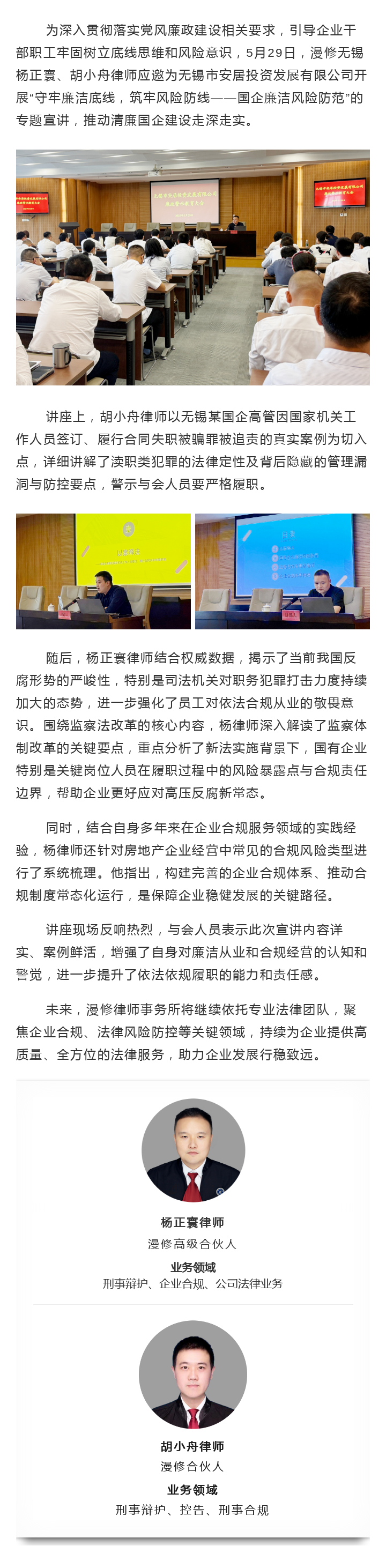 专业法律护航 | 漫修无锡杨正寰、胡小舟律师为无锡市安居投资发展有限公司开展国企廉洁风险防范专题宣讲