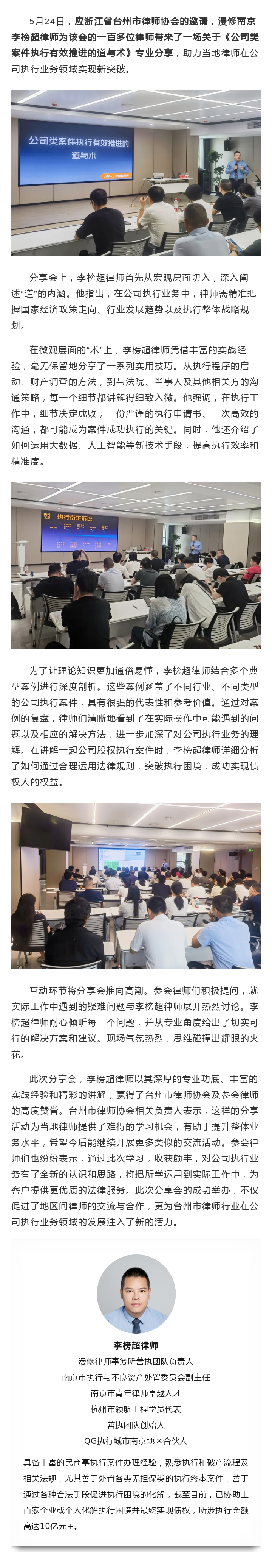 漫修南京李榜超律师为浙江省台州市律协开展《公司类案件执行有效推进的道与术》专题讲座