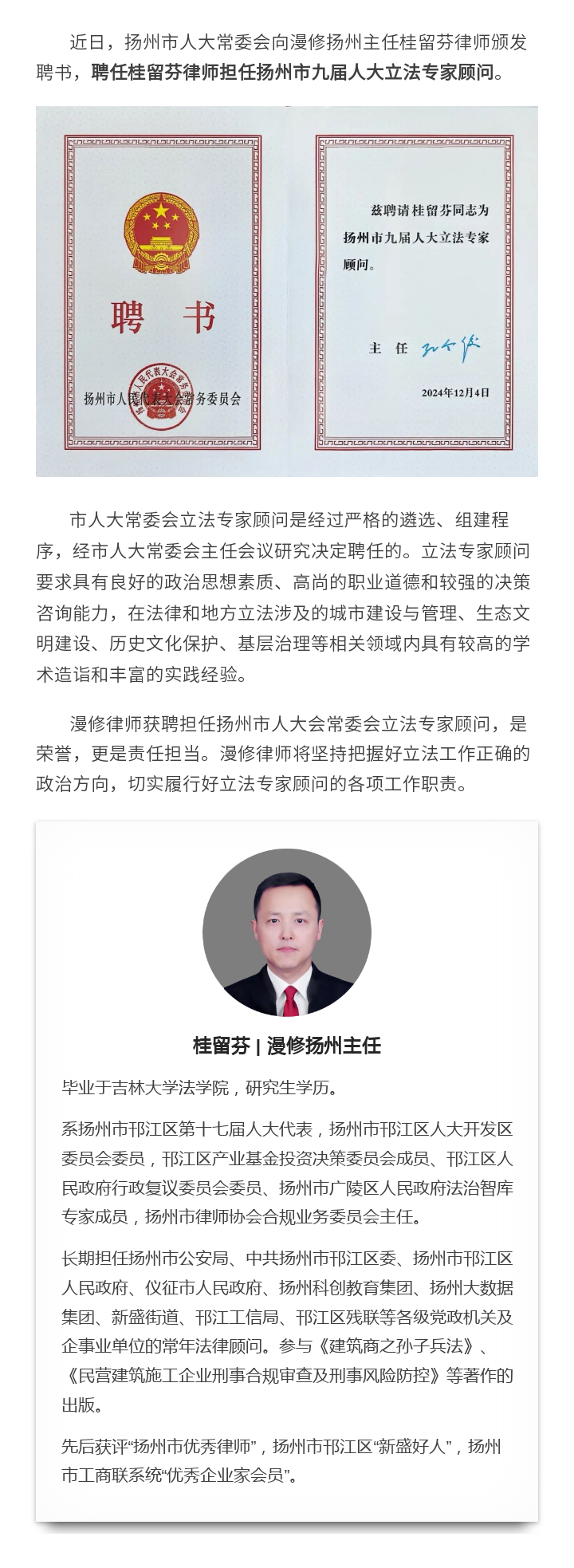 漫修扬州主任桂留芬获聘扬州市人大常委会立法专家顾问