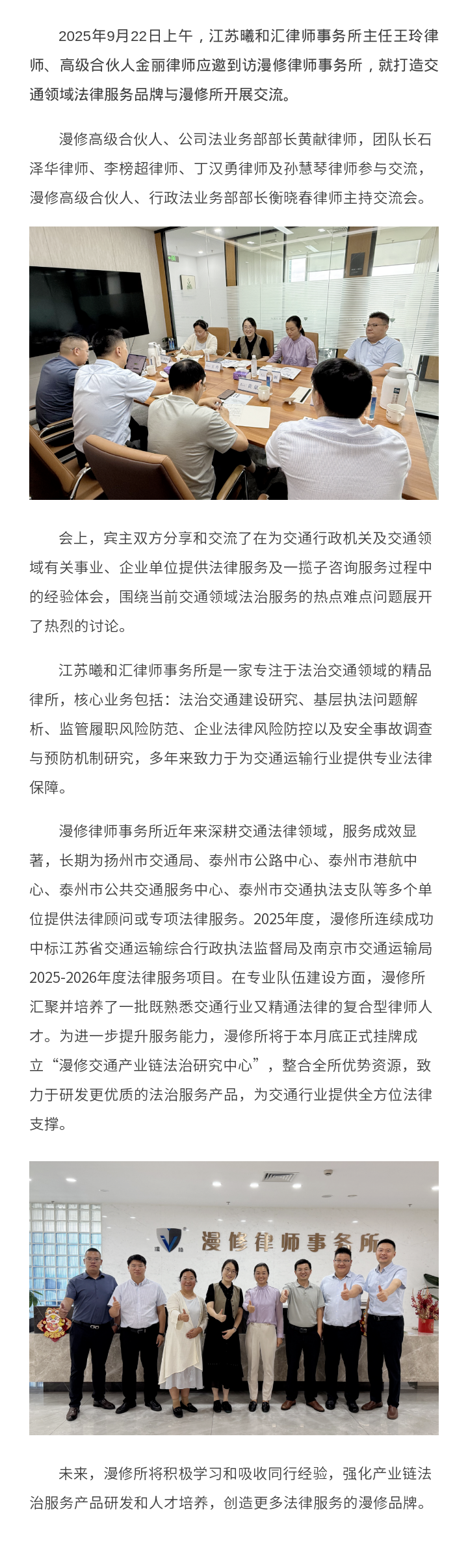探讨打造交通领域法律服务品牌 | 漫修律师事务所与江苏曦和汇律师事务所开展业务交流
