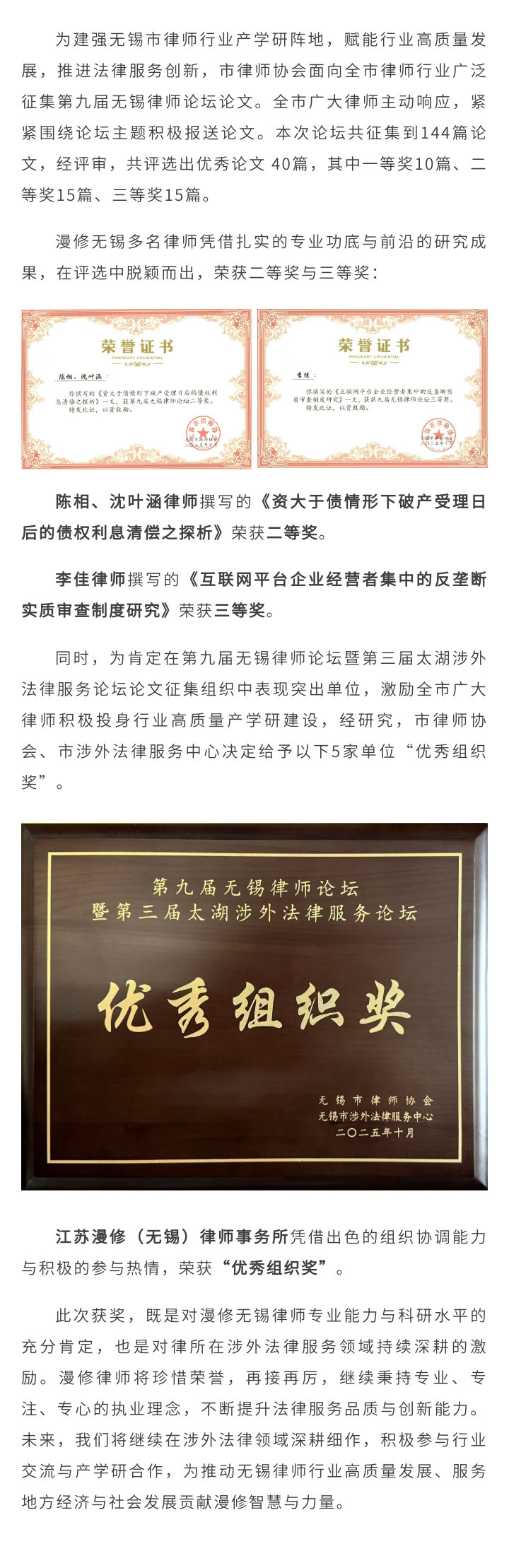 专业深耕 载誉前行 | 漫修无锡律师论文与组织工作双丰收
