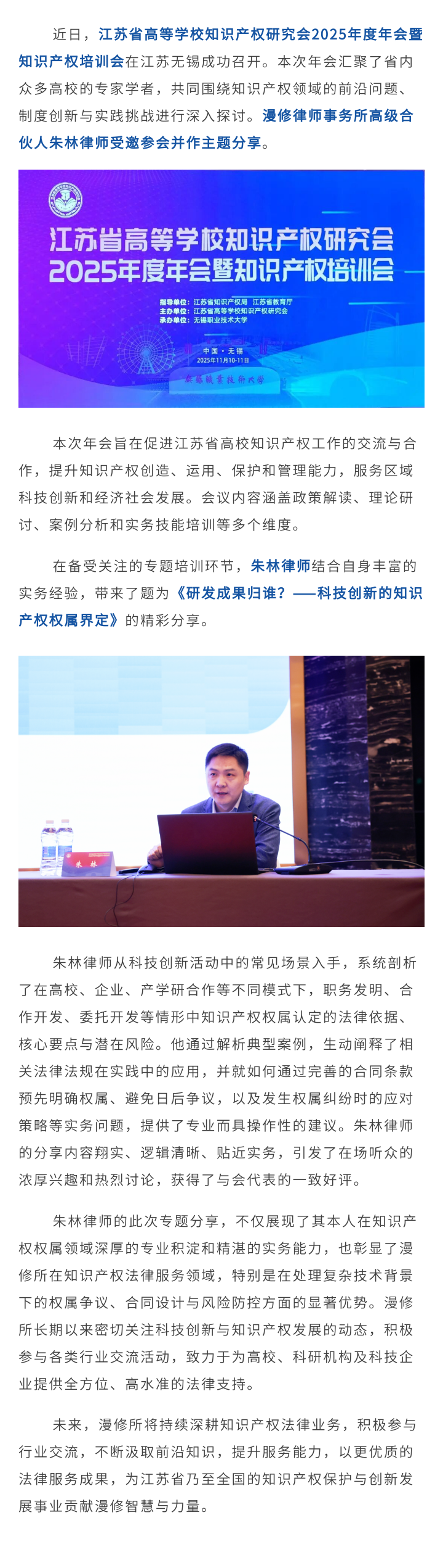 漫修高级合伙人朱林律师受邀出席江苏省高等学校知识产权研究会2025年度年会并作主题分享