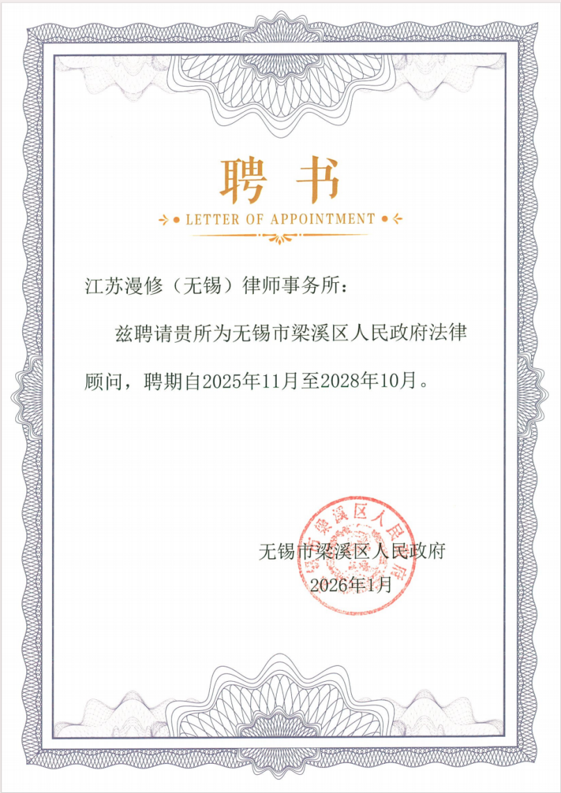 近日,无锡市梁溪区人民政府印发了《区政府办公室关于聘任区政府法律顾问的通知》,公布了新一届区政府法律顾问。继2022—2025年服务期满后,江苏漫修(无锡)律师事务所续聘为梁溪区政府法律顾问,聘期自2025年11月-2028年10月止。 我所长期受聘担任宜兴市人民政府、无锡市滨湖区人民政府、无锡市梁溪区人民政府、惠山区人民政府、锡山区人民政府、无锡市房管中心、无锡市政府房屋征收管理办公室、无锡市新吴区人大、无锡市机场集团等数十家政府机关、事业单位及国有企业的常年法律顾问,多名律师入选新吴区人民政府法律专家库。近年来为梁溪区重大征收拆迁项目,招商引资项目,重大行政决策事务,数据法律服务等提供法律支持。 身为法律顾问,我们既是法律底线的坚定捍卫者,也是依法行政的亲密合伙人;既是护航法治建设的重要参谋,也是守护一线担当的坚强护盾。此次受聘,是对我所专业能力、服务水平的充分肯定。未来,我所将依托专业法律服务团队,聚焦依法决策、依法行政、矛盾化解等重点工作,以严谨务实的态度、专业高效的服务,助力梁溪区法治政府建设与经济社会高质量发展,以法治力量赋能区域发展。